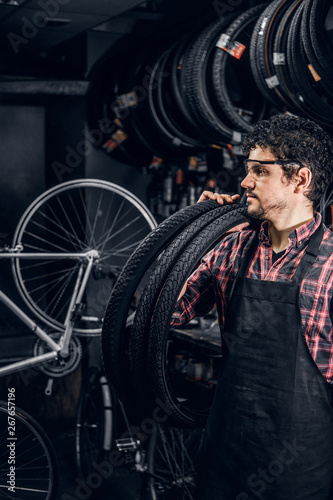 Pensive happy man in protective glasses is standing with tires at bicycle repairing studio.