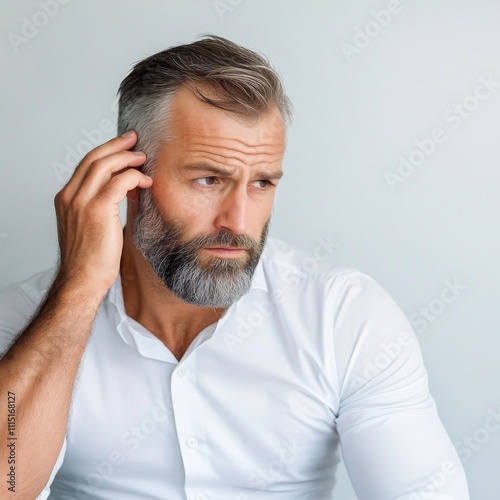 Pensive man in white shirt reflecting on life choices indoor modern setting portrait photography neutral background