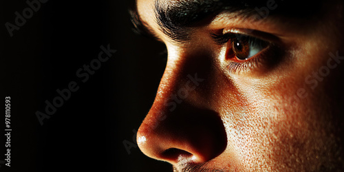Pensive Profile: A man's face, softly illuminated, revealing a pensive expression.