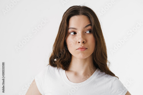 Pensive young woman thinking isolated over white