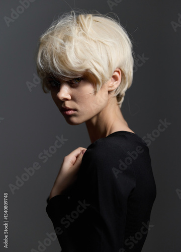 Pensive young woman with short platinum blonde hair, dressed in a sleek black outfit, standing against a dark grey background. A moment of introspection and elegance.
