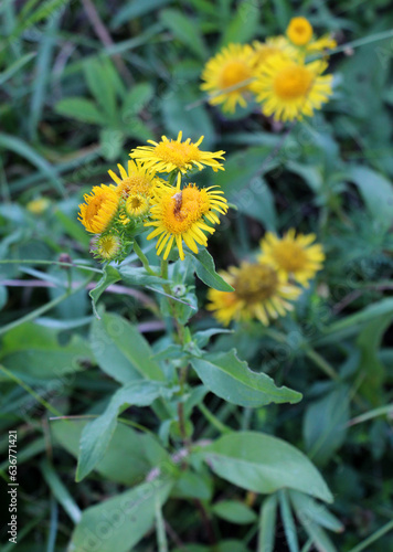 Pentanema britannicum (Inula britannica) blooms in the wild in summer.