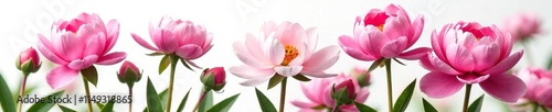 Peony flowers in full bloom on a white background with slight warmth, nature, warm light, blossom