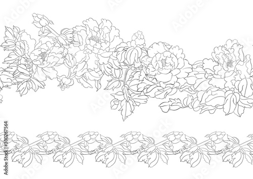 peony, flower, floral, chinese, tree, hybrid, painting, silk, traditional, batik, branch, leaf, flower petals, botany, botanical, outline, realistic, realism, summer, pattern, background, repeating, wallpaper, texture, textile, wrapping, line, art, hand, drawing, contour, path, footed, vector, illustration