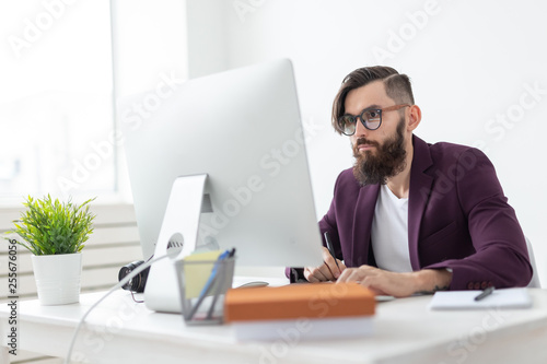 young, illustrator, draw, tablet, side, view, portrait, professional, designer, man, working, computer, office, photogenic, graphic, design, artist, desk, technology, creativity, work, digital, tool, pen, editor, monitor, adult, drawing, human, skill, job, designing, screen, using, digitize, sitting, studio, white, background, beard, 20s, 30s, european, goggles, table, purple, jacket, indoor