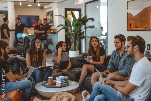 people at modern office working together. Work meeting at coworking. Casual laid back atmosphere at workplace.