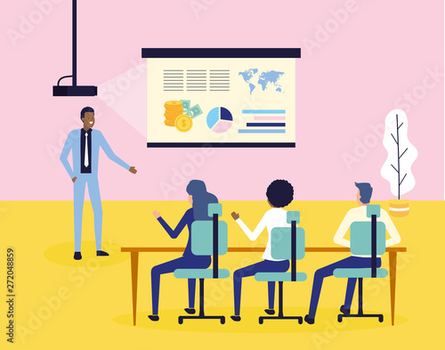 businessperson, business, presentation, office, vector, illustration, report, meeting, teamwork, team, work, corporation, group, businesswoman, people, strategy, standing, present, employee, corporate, negotiate, projector, woman, idea, forecast, brainstorming, plan, businessman, man, success, colleague, partner, graphic, balance, revenue, growth, video projector, successful, profit, value, finance