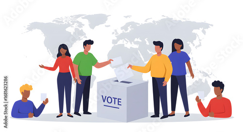 People casting votes in a transparent ballot box with a world map in the background, signifying global elections and democratic participation in a civic process