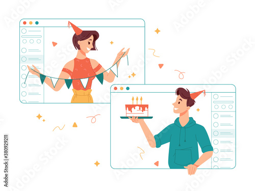online, party, birthday, quarantine, vector, celebration, technology, congratulation, celebrate, home, virtual, computer, cyberspace, digital, girl, happy birthday, character, communication, call, woman, hat, window, confetti, conference, serpentine, isolation, video, anniversary, greeting, meeting, screen, remote, distance, surprise, celebrate, candle, happiness, flat, cartoon, cake, congratulation, holiday, teleconference, friends, illustration