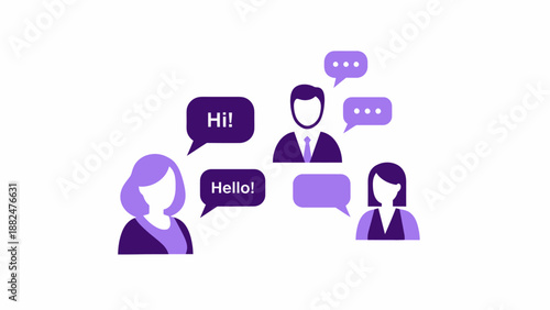 People communicating with speech bubbles in a business setting.