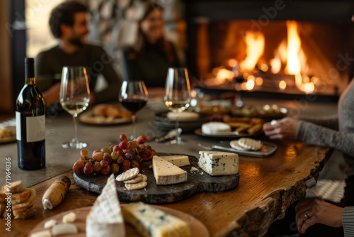 People eating cheese and drinking wine in front of a fireplace in a cottage. Generative AI