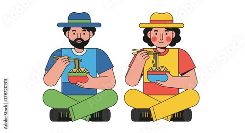 noodle, asian, eating, people, bowl, illustration, chopstick, food, ramen, cartoon, lunch, dinner, meal, delicious, cookery, eatery, healthy, fresh, tasty, colourful, design, drawing, art, vector, graphic, style, isolated, background, modern, simple, flat, cheerful, happy, couple, together, black, sitting, hat, pose, enjoyment, culture, casual attire