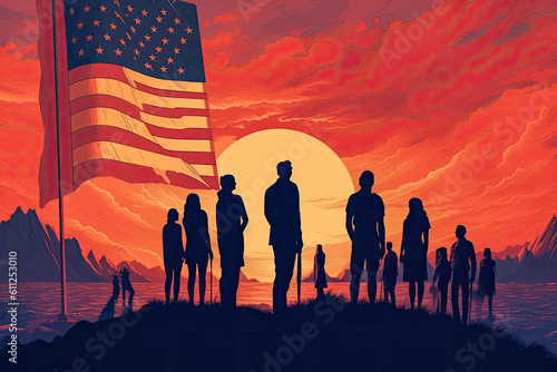 People from all walks of life standing in front of the US America flag. Abstract illustration. Generative AI