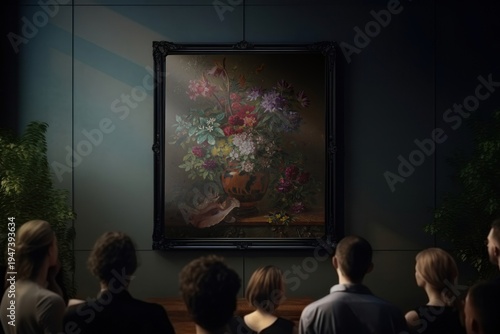 hi-res, art exhibition, natural light, downloadable, art gallery, flower vase, backview, backview, interior, painting, artwork, hanging, indoor, admire, design, female, flower, gazing, museum, people, shadow, adult, children, human, image, photo, plant, woman, head, male, suit, art, boy, children, man, hd