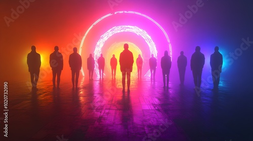 People in a perfect ring formation, connected by holographic lines, symbolizing equality, abstract background with neon colors, futuristic pop art style, glowing effects