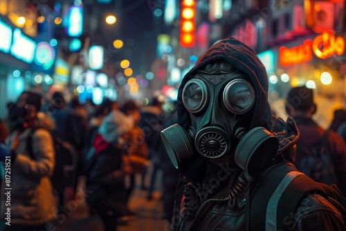 people in gas masks protective suits city