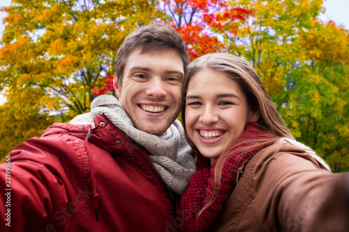 people, leisure and technology concept - happy teenage couple taking selfie over autumn park background