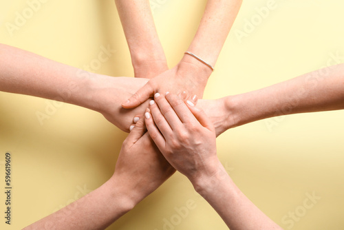 People putting hands together on yellow background, top view. Friendship concept