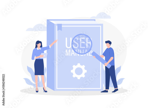 People reading guidebook, writing guidance, instruction manual. Modern vector flat illustration