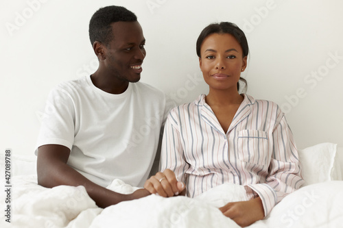 People, relationships and marriage concept. Portrait of handsome young black man in white t-shirt sitting on bed with his beautiful wife in the morning, looking at her with love and affection, smiling