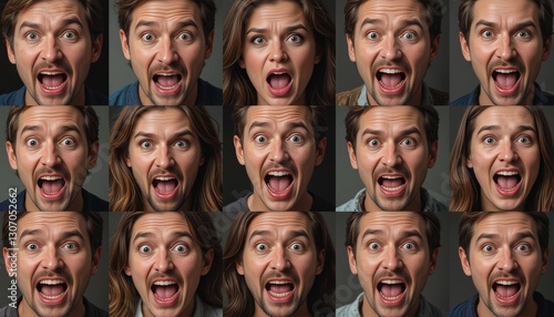 person, screaming, fear, face, mouth, open, eye, looking, closeup, collage, grid, row, column, man, woman, expression, emotional, dramatic, stress, surprise, panic, shout, scared, anxiety, frustration, despair, portrait, studio, head shot, attitude, communication, react, yelling, fearful, anxious, stressful
