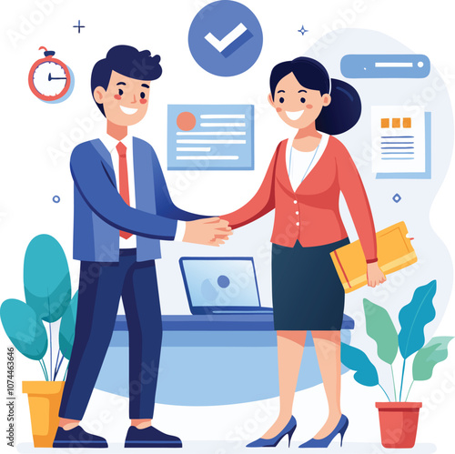 People shaking hands at work - Two businesspeople, man and woman doing handshake in office at work while smiling over business agreement and deal. Flat design stock illustration on white background