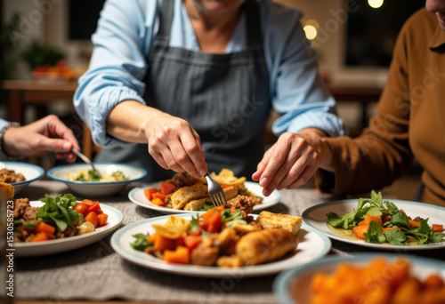 food, meal, dinner, vegetable, salad, fried, plate, sharing, people, dining, table, fresh, colourful, dish, cookery, gathering, social, eatery, casual attire, healthy, appetising, delicious, homemade, celebration, feast, nourishment, culinary, tasty, ingredient, plate, fork, spoon, community, friendship, enjoyment, hospitality, tableware, serving, produce, organic, wholesome, copy space, space