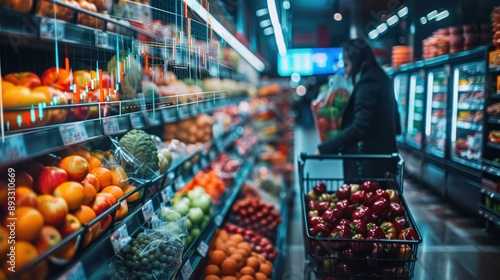 People shopping in a grocery store with an overlaid stock market graph. The graph displays fluctuating financial data