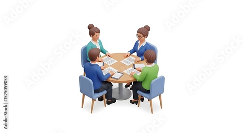 person, sitting, table, meeting, discussion, document, round, chair, businessperson, office, indoor, teamwork, collaboration, analysing, together, corporate, work, team, finance, technology, tablet, presentation, strategy, project, planning, brainstorming, negotiation, professional, paper, review, illustration, cartoon, design, communication, success
