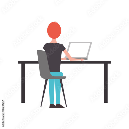 computer, office, desk, chair, vector, illustration, work, workplace, workspace, business, people, person, design, men at work, job, technology, table, concept, desktop, laptop, modern, cyberspace, flat, man, web, monitor, character, view, screen, sitting, communication, back, cartoon, male, freelancer, professional, background, to sit, icon, manager, freelance, corporate, occupation, designer, typing