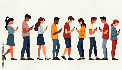 People stand in line looking at smartphones. Diverse group waits in queue. Digital communication, modern lifestyle. In line waiting. Digital addiction theme. Illustration of tech culture. Image shows