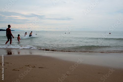 People swimming in calm Mediterranean sea in Sicily (Italy) at sunset