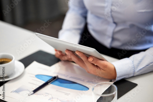 people, technology and corporate concept - close up of businesswoman with tablet pc computer at office