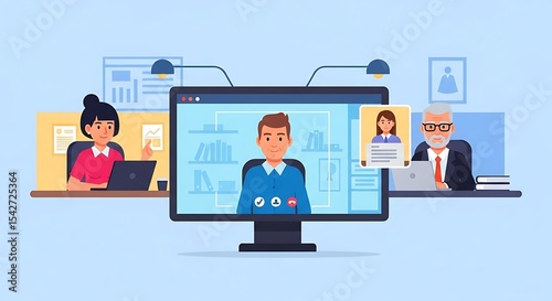 person, call, man, woman, connect, talk, flat, corporate, desk, office, work, computer, laptop, screen, book, report, chart, paper, buttons, attaching, goggles, hair, shirt, jacket, table, online, remote, digital, meeting, conference, business, discussion, communication, collaboration