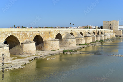 People walking on the historic Roman Bridge spanning the Rio Guadalquivir in Cordoba, Andalucia, Spain