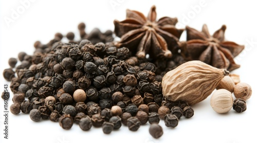 Peppercorn macro. Black Pepper isolated on white. Peppercorns on white background. Full depth of field.