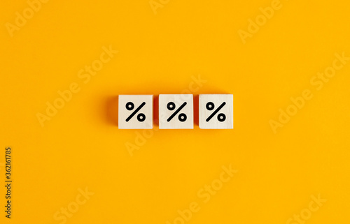 Percent signs on wooden cubes. Concept of discount and sale.