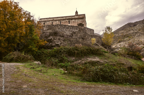 Perched high in the mountains monastery for old stone wall in the autumn overcast day