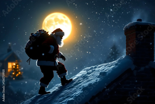 Père Noël marchant seul sous la pleine lune – ambiance magique et poétique