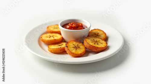 Perfectly fried plantain slices served with sauce on a minimalistic plate