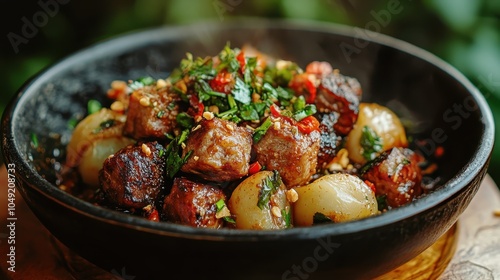 Perfectly roasted beef cubes with baby potatoes, topped with fresh herbs and spices, served hot in a rustic black bowl for a heartwarming culinary experience.