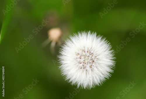 Perfectly round white dandelion fluff floating softly against a dark green background (Flowerhead closeup macro photograph)