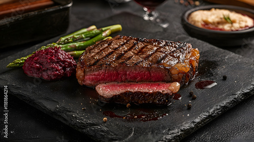 Perfectly Seared Ribeye Steak on Slate with Asparagus and Sauce