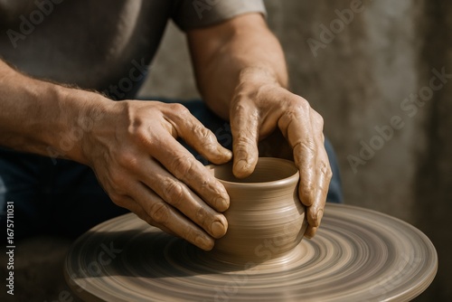 performance in creation labor concept. Craftsman shaping clay pot on a pottery wheel with skilled hands.