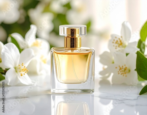 perfume, advertisement, fragrance, trend, closeup, editorial, photo, luxurious, bottle, placed, marble, surface, surrounded, blooming, floral, soft, natural, light, elegant, reflections, gold, accent, shot, modern, mag, photo, style, high, end, branding, composition, intense, colours, fragrant, woody, note, represent, visual, creative, lighting