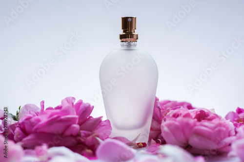 Perfume bottle in pink flower roses. Spring background with luxury aroma parfume. Beauty cosmetic fresh aromatic