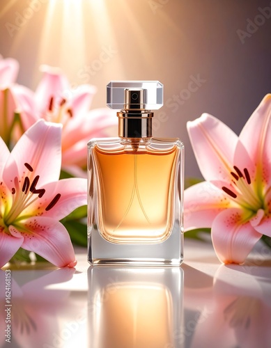 perfume, bottle, lily, flower, light, amber, glasses, gold, fragrance, beauty, luxury, elegant, aroma, product, soft, pretty, glamour, studio, spring, floral