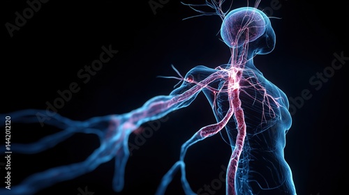 Peripheral Neuropathy Awareness Week, illustration. Artistic illustration of human nervous system with glowing blue peripheral nerves extending through limbs, anatomical accuracy with stylized element