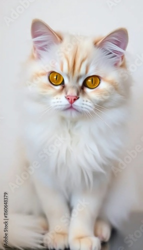 Persian cat with yellow eyes, pure white body, fluffy fur, sitting gracefully.