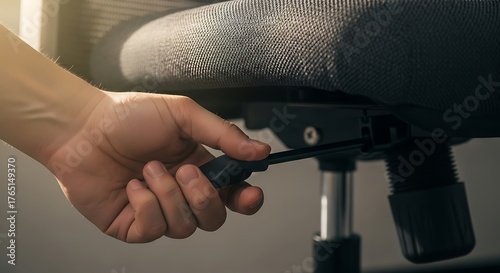 person, adult, hand, adjusting, chair, office, workspace, modern, ergonomic, natural light, lighting, grey, black, adjustment, lever, sitting, furniture, interior, work, professional, technology, indoor, minimalist, business, design, office equipment, height, interior design